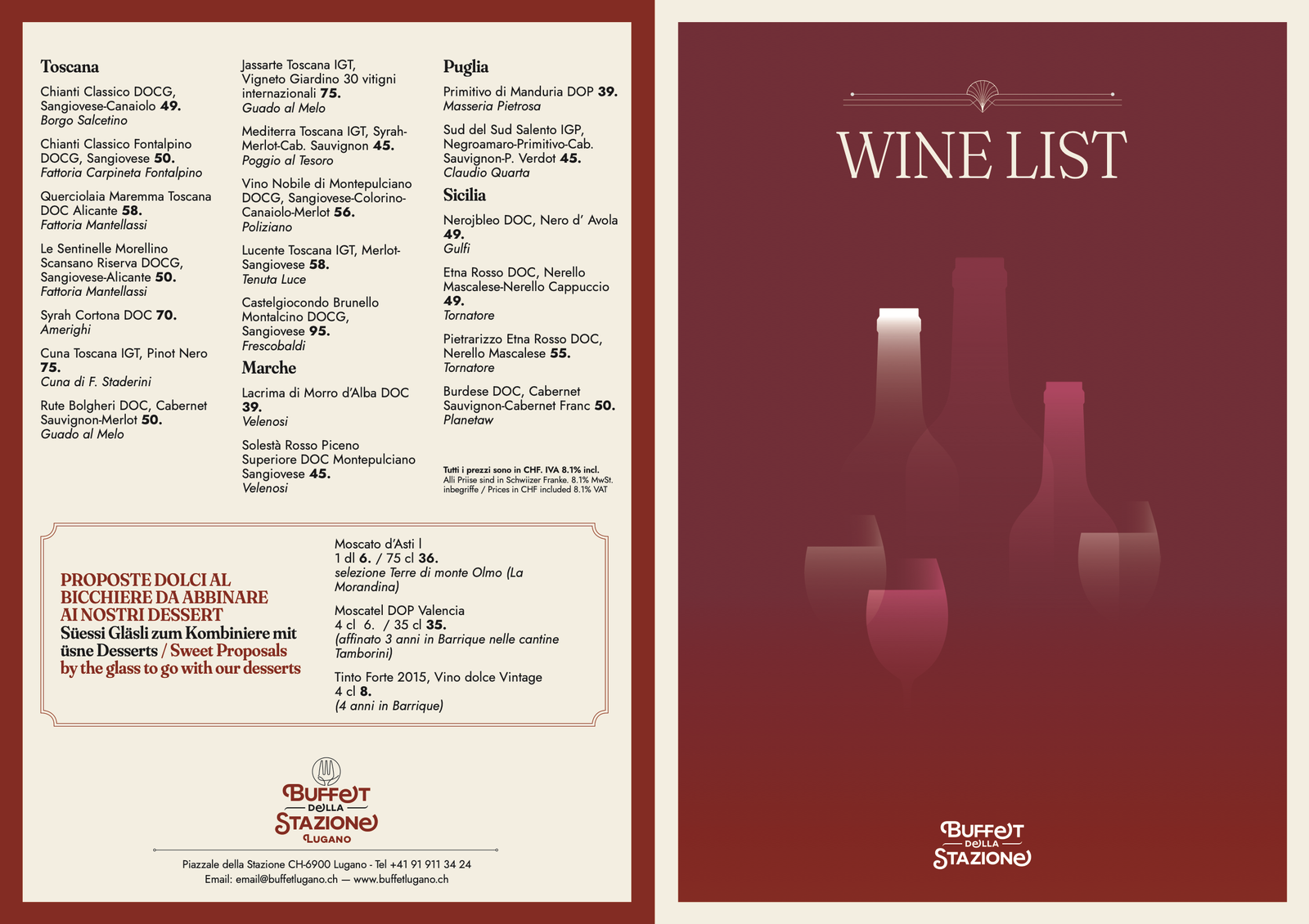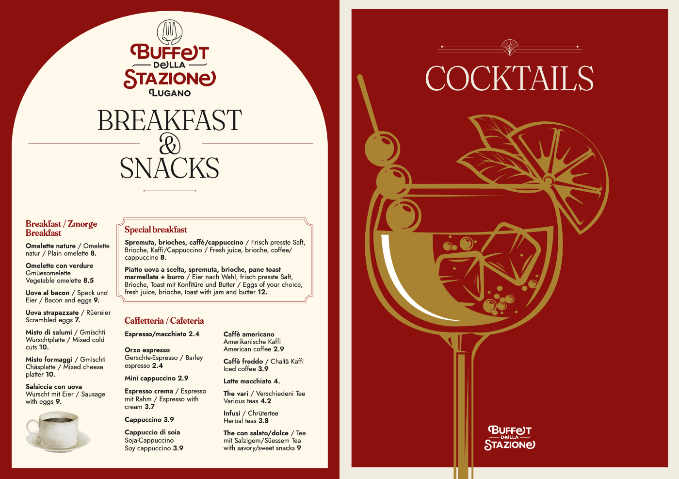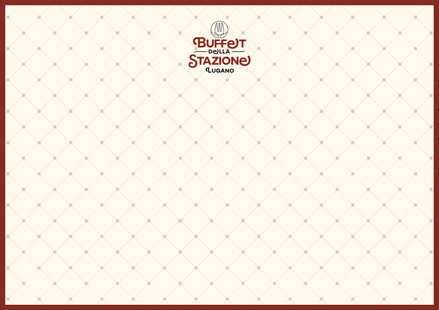 Questo è uno dei progetti più vasti che ho realizzato negli ultimi anni a livello di visual identity. Il ristorante della stazione di Lugano ha subito un totale restyling in occasione del termine dei lavori alla stazione stessa. Nuovi arredi e uno stile più elegante, moderno e retrò allo stesso tempo. Era quindi necessario rinnovare tutta l’dentità visiva in modo da rispecchiare il nuovo stile e rendere coerente tutto l’immaginario visivo. Ho quindi identificato uno stile che riprende in parte il liberty ma che comunque è ancorato ai giorni nostri cercando un risultato “senza tempo”.